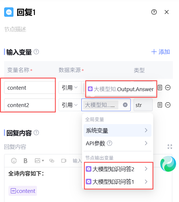 回复节点主要是将工作流的运行结果输出给用户,此时我们的回复节点就需要接收大模型知识问答 1 和 大模型知识问答 2 节点的输出变量 Output.Answer 来作为 回复节点的 输入变量