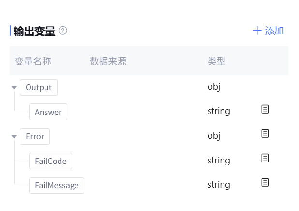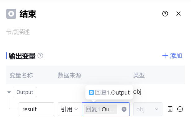 回复节点的输出变量如下,后续我们在结束节点,只需要接收回复节点的输出变量 Output 即可