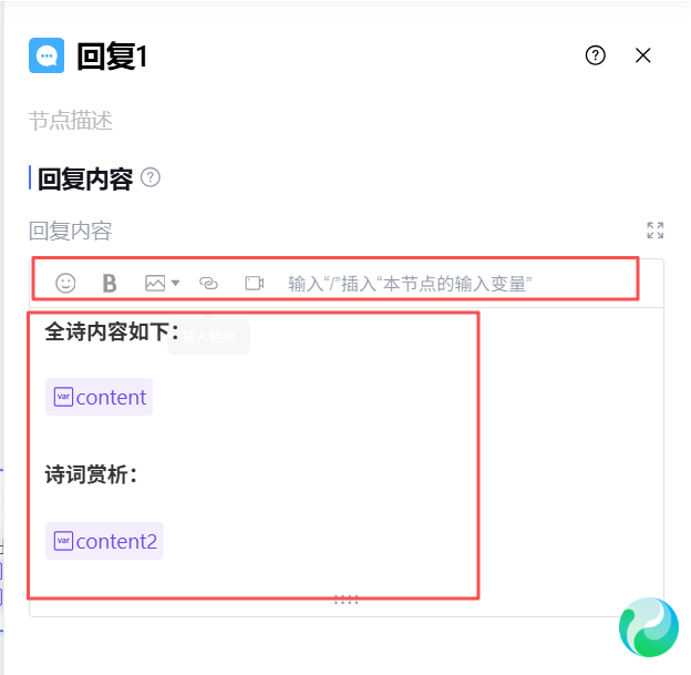 到这里,从设计上,我们已经可以通过一句诗词内容来获取整首诗词内容以及诗词赏析内容了,下面我们就可以继续配置回复节点,来将工作流的运行结果输出给用户。