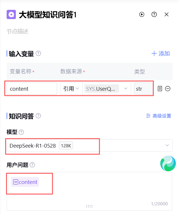 开始节点之后,我们选择 大模型知识问答 节点,这里我们配置 大模型知识问答 节点的 输入变量为 SYS.UserQuery ,知识问答 模型选择 DeepSeek-R1-0528 :【DeepSeek-R1 模型最新版,在理解意图、文案生成、编程能力和逻辑推理方面均有显著提升。能更好地理解复杂指令中的约束条件和内在逻辑。支持长时思考,可以胜任更复杂、耗时的任务。】用户问题 引入输入变量