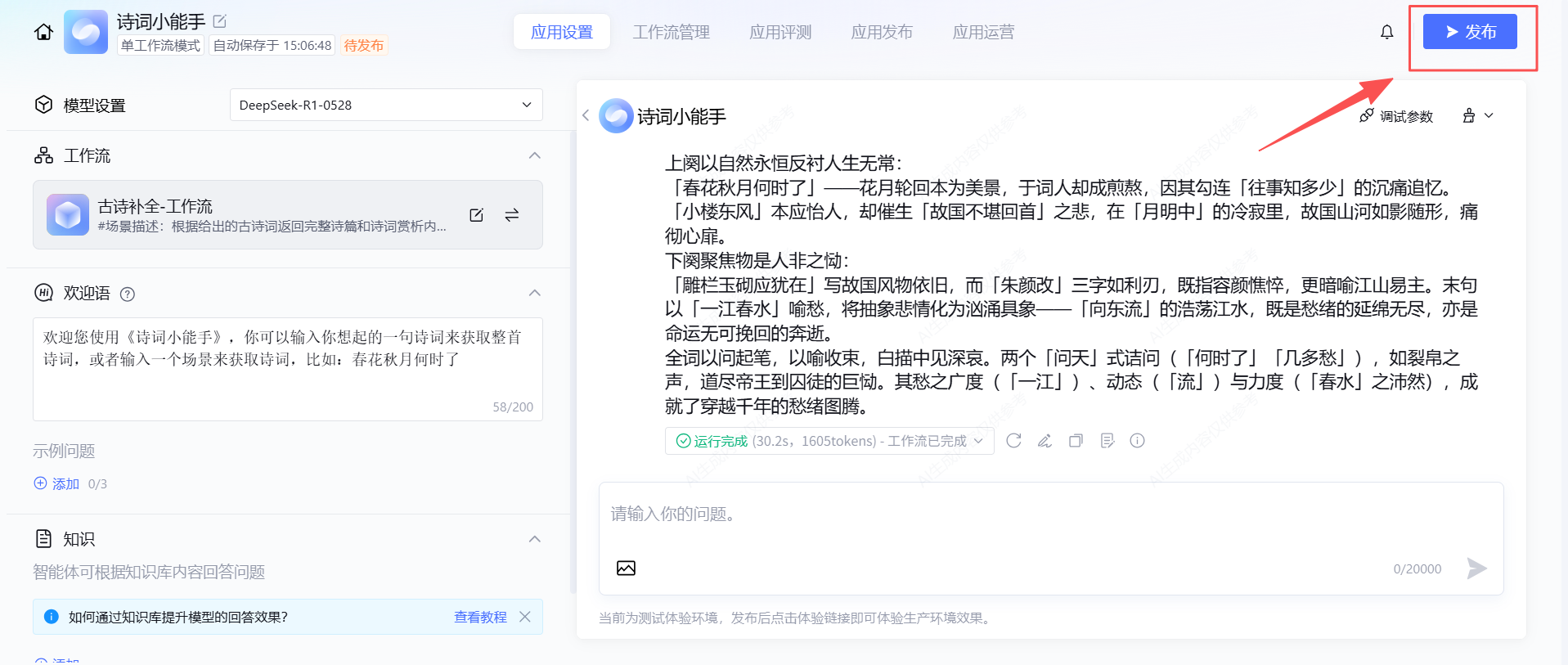 到这里,我们的 诗词小能手 智能体就算配置完成了,