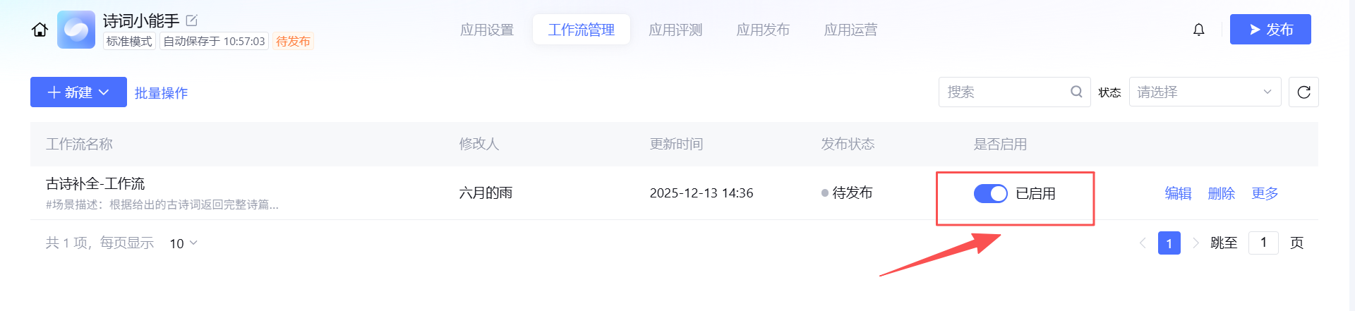 工作流的发布就比较简单了,等待工作流调试完成没有问题之后,点击 工作流配置面板左上角的 <- 回到【工作流管理】页面,找到我们创建的工作流,点击【启用】按钮,完成工作流的启用