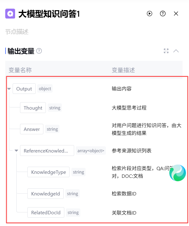大模型知识问答 节点输出变量结构如下,对于我们来说,其实我们需要的是 Output.Answer 的内容