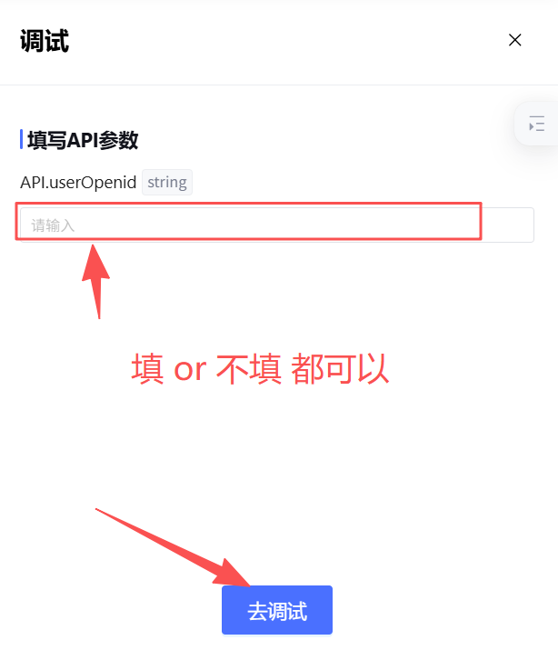 点击【调试】按钮,在调试窗口 对于 API 参数,我们填不填都可以,这里我不填了,直接点击【去调试】