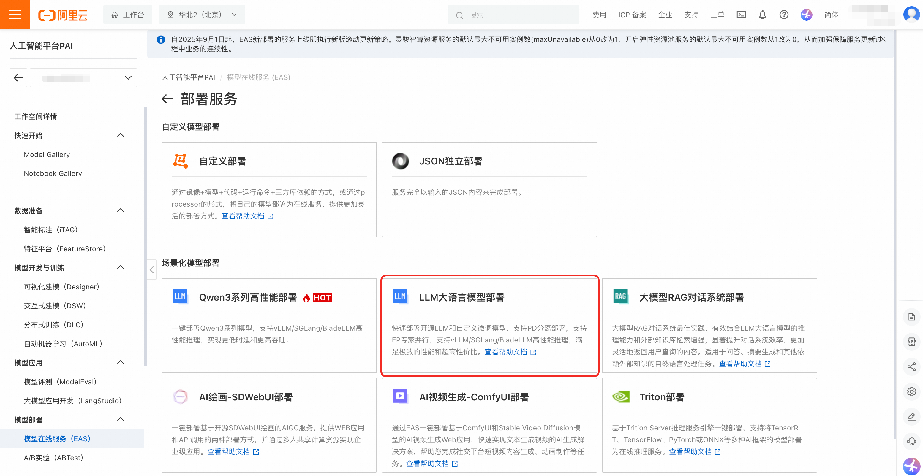 打开 PAI 控制台(https://pai.console.aliyun.com/),点击左侧菜单栏「模型在线服务(EAS)」。点击「部署服务」,选择「LLM 大语言模型部署」。