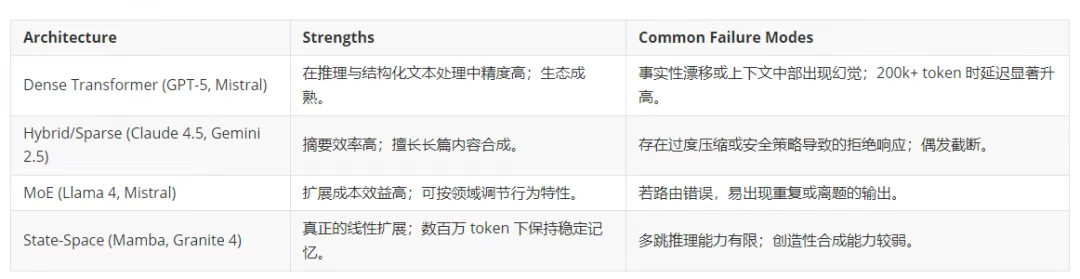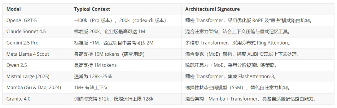 当前的大模型生态已分化为若干独特的架构谱系,各自在推理深度、记忆持久性和计算效率之间做出不同的权衡。 下表总结了 2025 年底部分主流基础模型的上下文窗口情况。