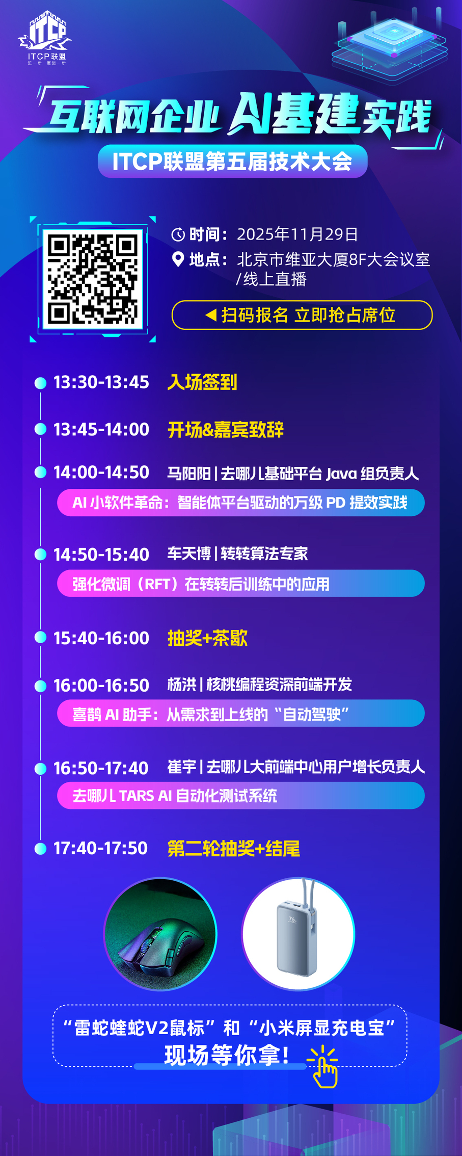 秉持“近一步,更进一步”的精神,本次 ITCP 联盟技术大会特设【AI 基建专场】与【AI 应用专场】,旨在搭建汇聚 AI 前沿理念与实战经验的交流平台,并携手联盟内各公司,共同展示在 AI 基础设施建设与应用落地方面的优秀成果与最佳实践。