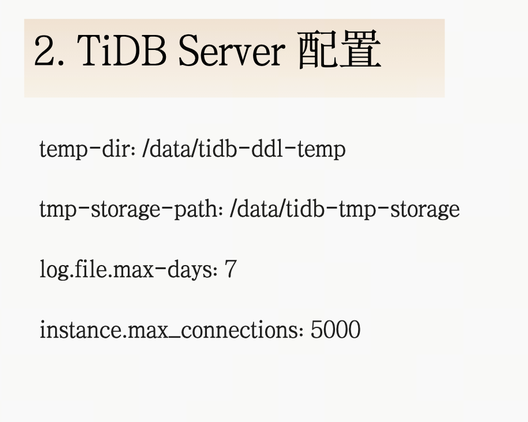 日志保留时间统一设为 7 天,单个节点的最大连接数设置为 5000,在满足业务需求的同时,防止突增流量导致数据库挂掉,起到保护 TiDB 的作用。