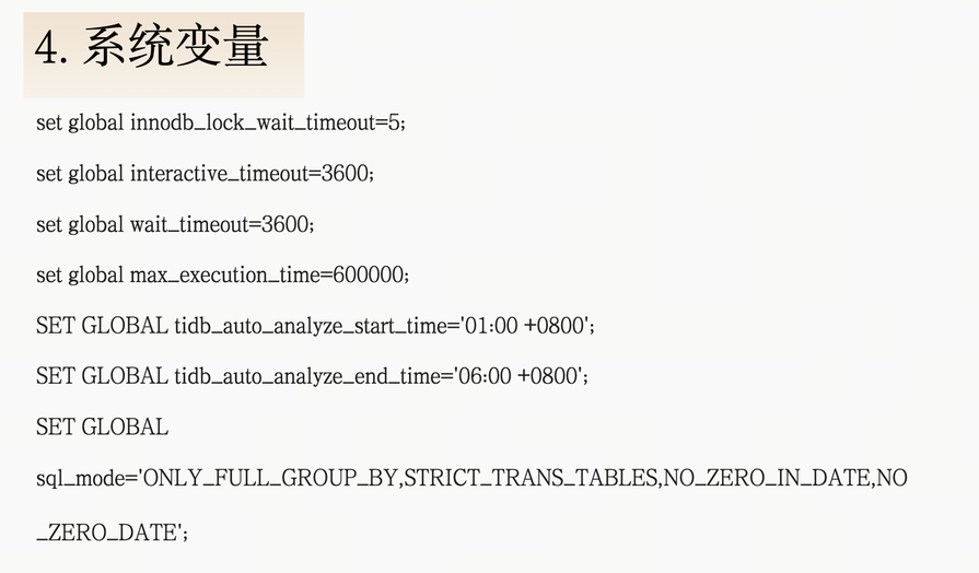 SQL Mode 是一个重要参数,尤其对于从 MySQL 迁移过来的业务,其设置会影响 SQL 执行的成败。在之前的 MySQL 迁移中,就曾因 SQL mode 不一样,导致在源库能正常执行的 SQL 在目标库执行失败,因此需要注意保持一致。