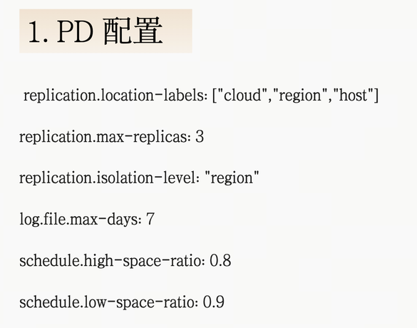 副本数采用默认的 3,日志保留时间设为 7 天,根据自身情况进行调整即可。对于磁盘充足和不足的阈值,默认不足阈值为 80%,考虑到使用 TiDB 通常数据量大、磁盘大,80% 的剩余空间仍很充足,我们将其调整为 90%,当达到该阈值时,PD 节点不再往该 tikv 节点调度数据,这样的设置完全能满足需求。