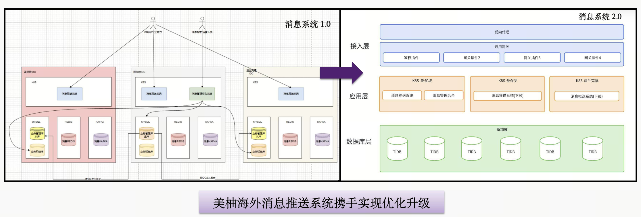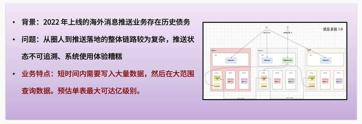 2024 年,我们迎来了将 TiDB 应用于实际业务的机会。当时,海外的消息推送业务 1.0 版本存在较大问题,其架构涉及三个 IDC,MySQL 主库位于新加坡,通过主从数据同步的方式分别同步到圣保罗和法兰克福,每个 IDC 都有一份消息系统,导致查询链路复杂,推送状态不可追溯,系统使用体验糟糕。