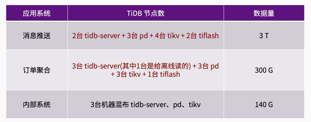 目前,我们上线了 TiDB 的系统主要有三个:消息推送系统,采用 2 台 TiDB、3 台 PD、4 台 TiKV 加 2 台 TiFlash 的配置,全部独立部署,数据量约 3T;订单聚合系统,有 3 台 TiDB,其中 1 台专门提供给大数据做离线分析,不影响在线业务;内部系统,由于重要性没那么高,采用混合部署以节省成本,数据量 140G。