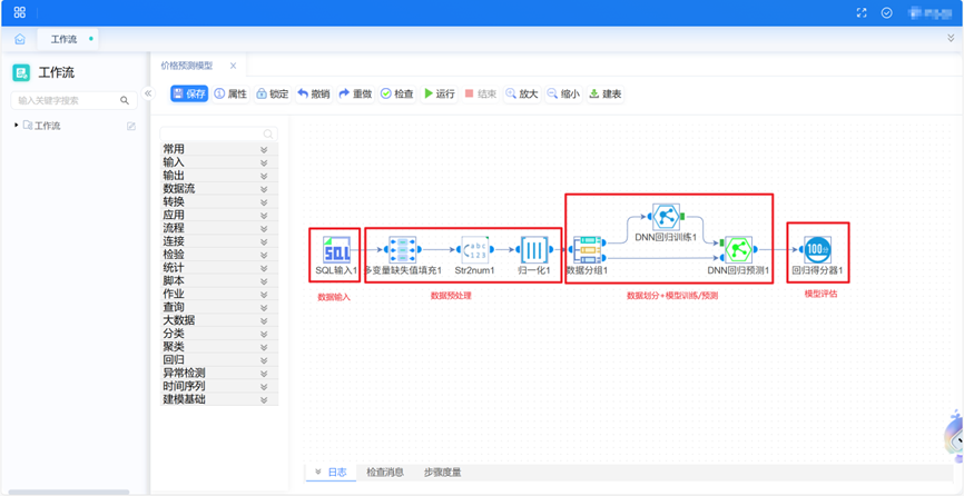 该阶段是保障模型效果的关键,包括多变量缺失值填充(支持均值、众数及插值等方法)、字符串转数值(Str2num)、数据归一化等操作,以提升数据质量与模型稳定性。