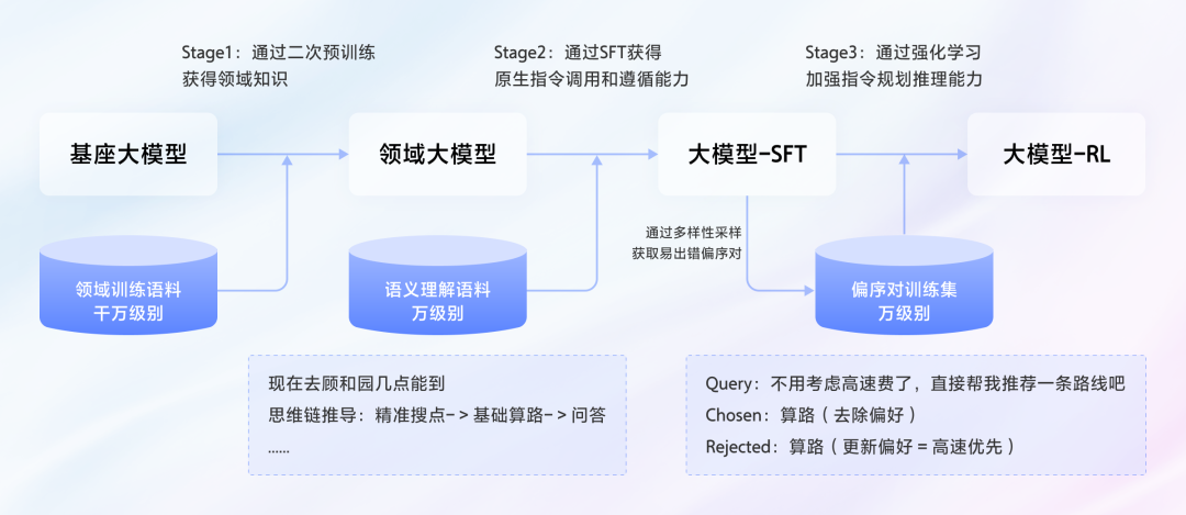 回到语音助手这个场景,结合地图智能体的任务,首先要针对地图场景深入精调大模型,百度地图通过文心一言基座大模型进行二次预训练、SFT、强化学习等手段,使地图大模型能够精确理解用户在地图中的各种常见表达,理解准确率高达 95%以上。