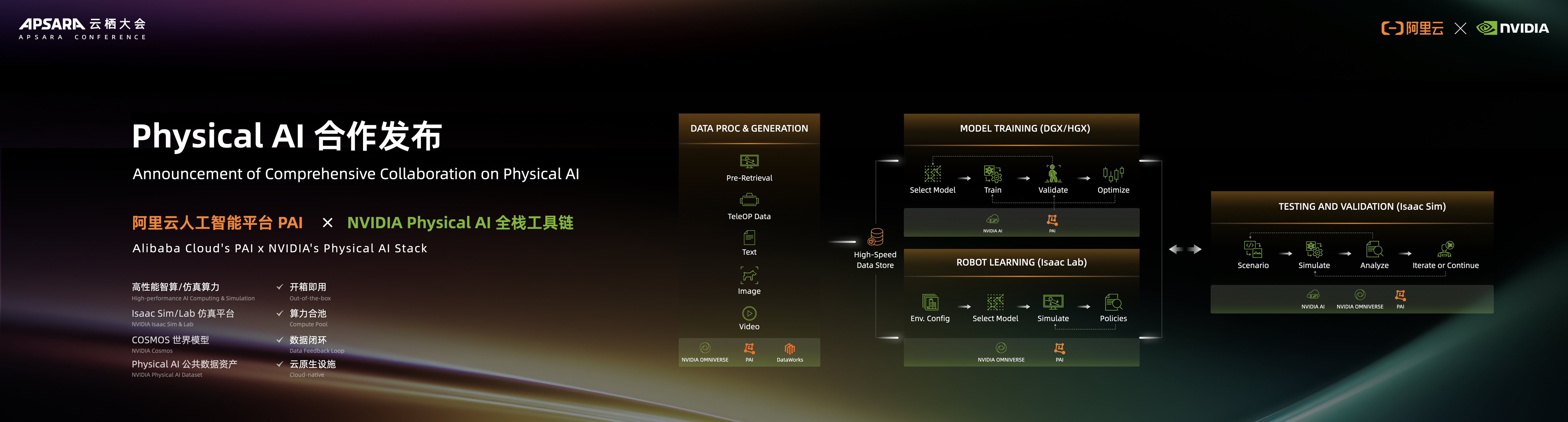 9 月 24 日,2025 云栖大会上,阿里云智能集团副总裁、阿里云大数据 AI 平台负责人汪军华携手 NVIDIA 机器人与边缘 AI 副总裁 Deepu Talla 宣布阿里云人工智能平台 PAI 与 NVIDIA Physical AI 软件栈进行全面集成。
