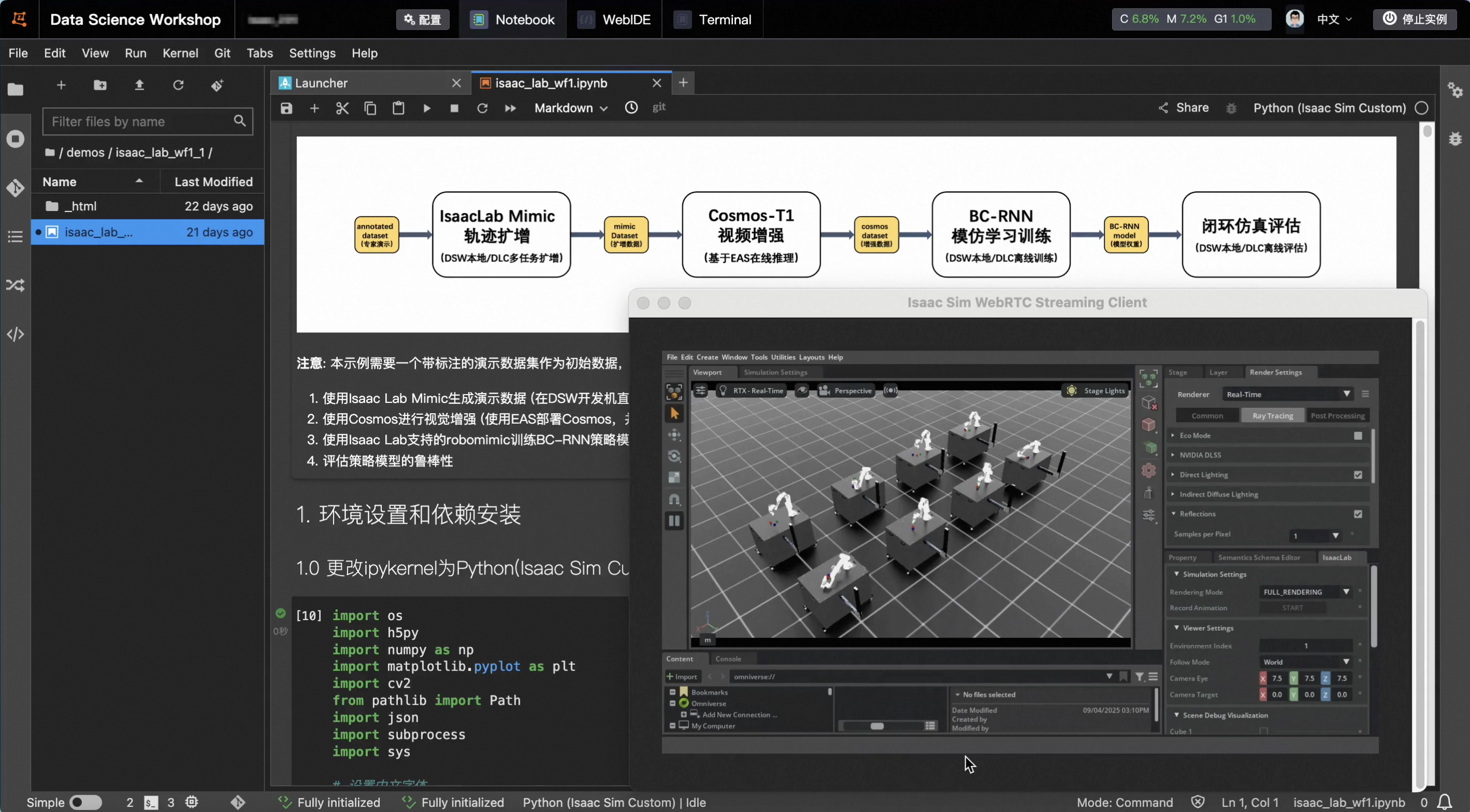 目前,PAI 提供了重点场景的最佳实践 Notebook,开发者可以快速启动具身智能项目的数据合成、模仿学习、强化学习和测试验证。