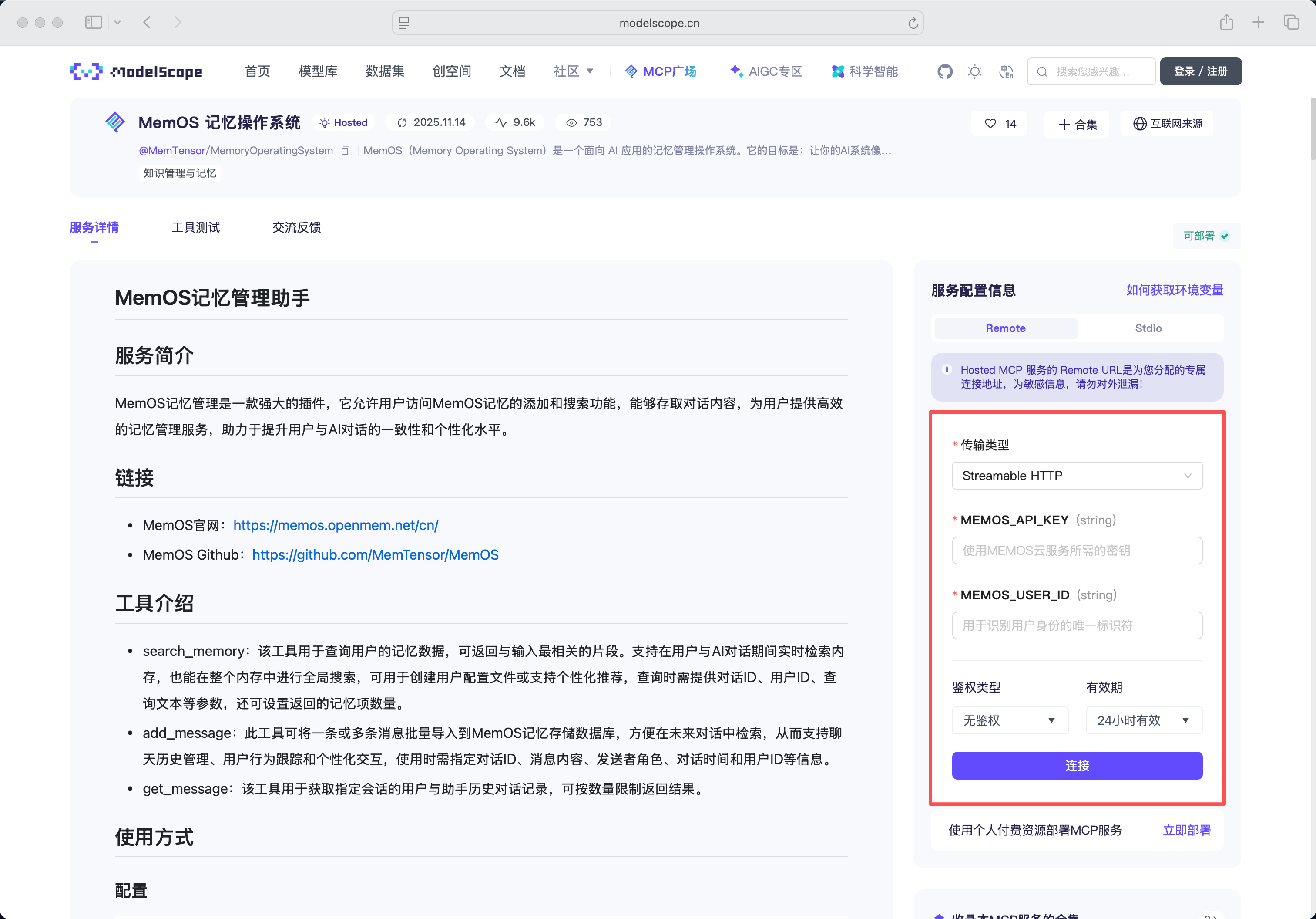 在创建 MCP 服务连接时填写 MEMOS_API_KEY 和 MEMOS_USER_ID,点击“连接”,即可利用魔搭社区的云端资源部署专属于你的 MemOS MCP 服务。
