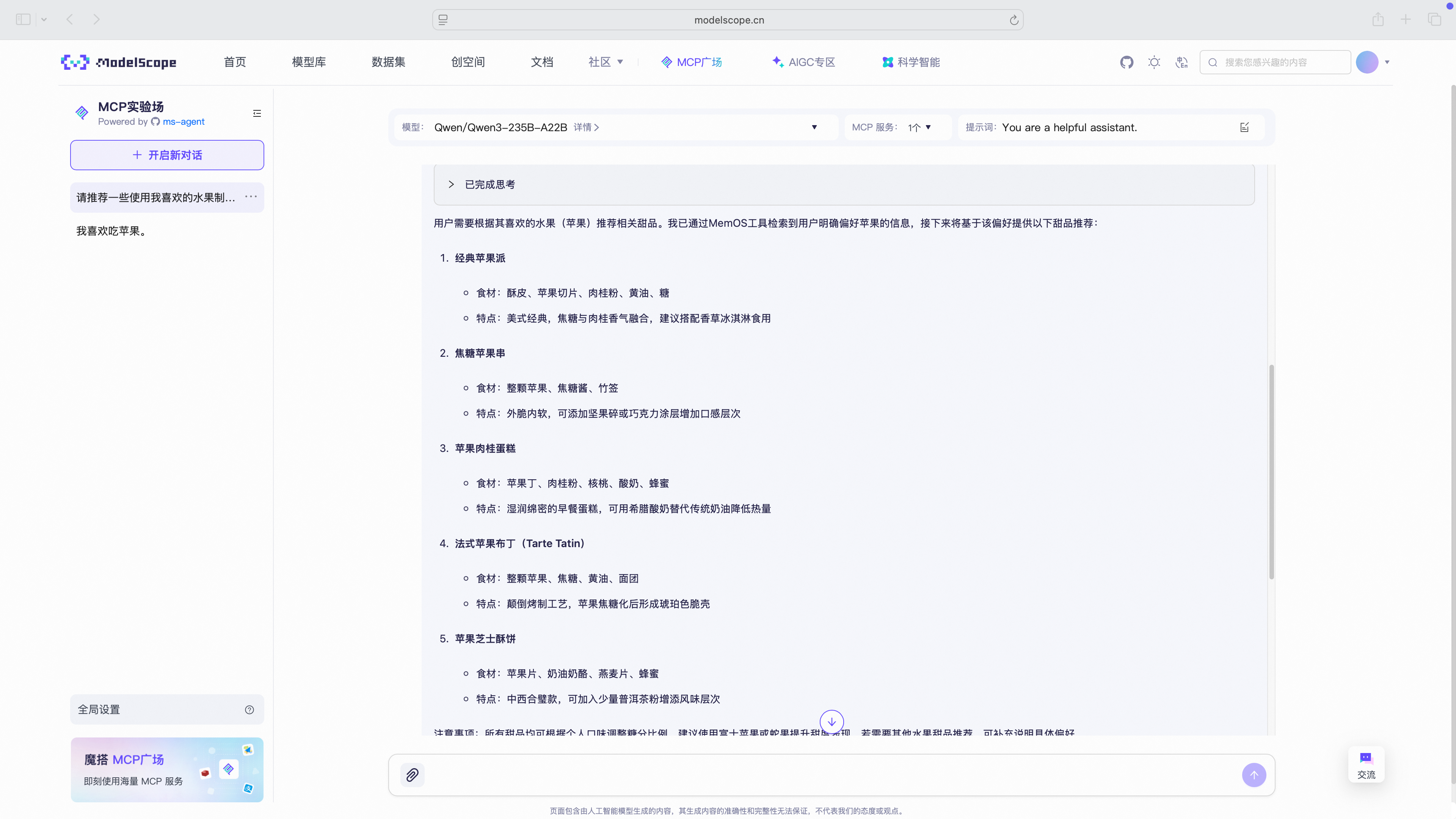 AI 将自动调用 MemOS 的偏好记忆模块, 返回“使用苹果制作的甜品推荐 🍰”。