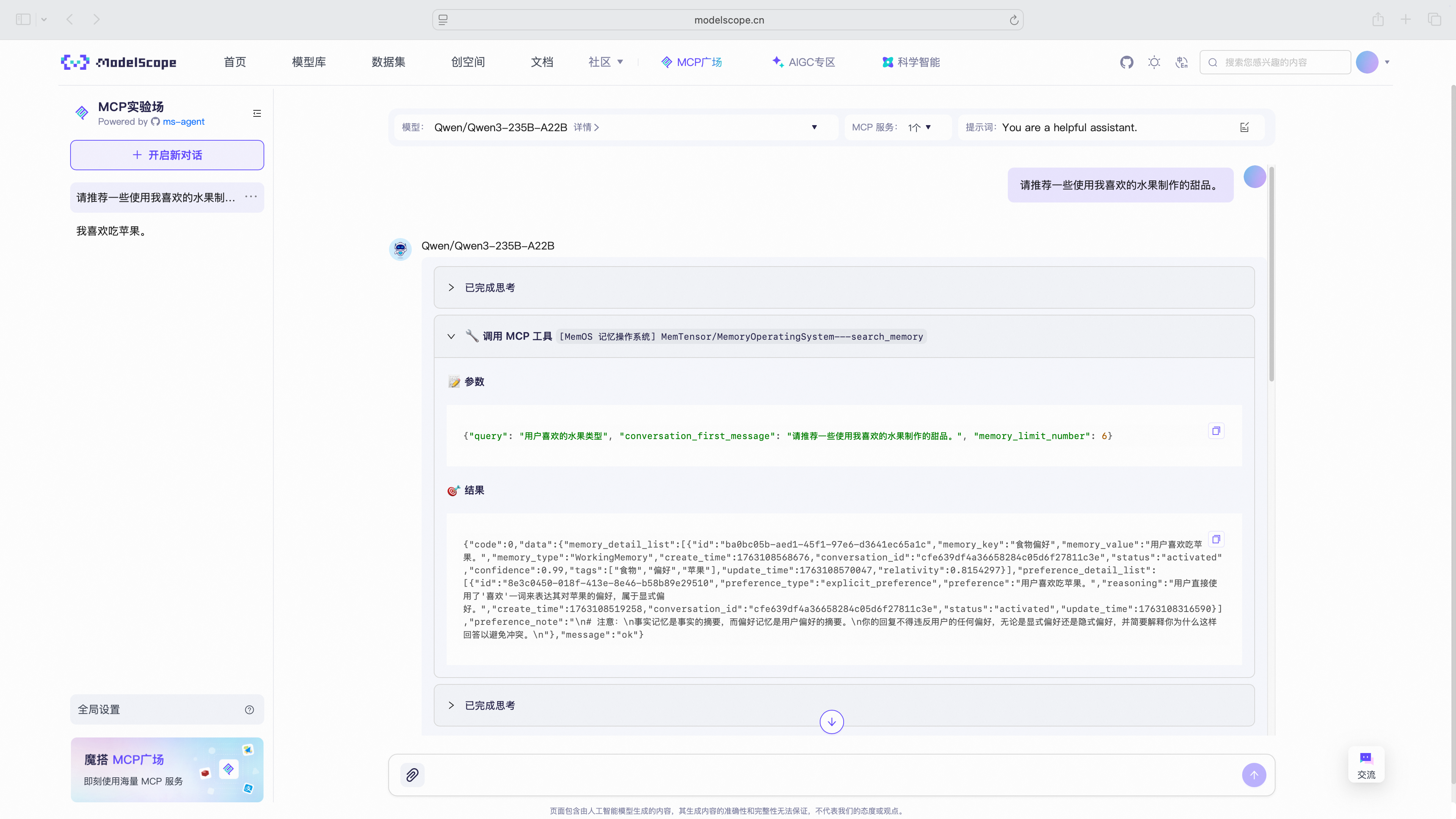 立即在魔搭社区体验 MemOS MCP 服务:ModelScope MCP 广场