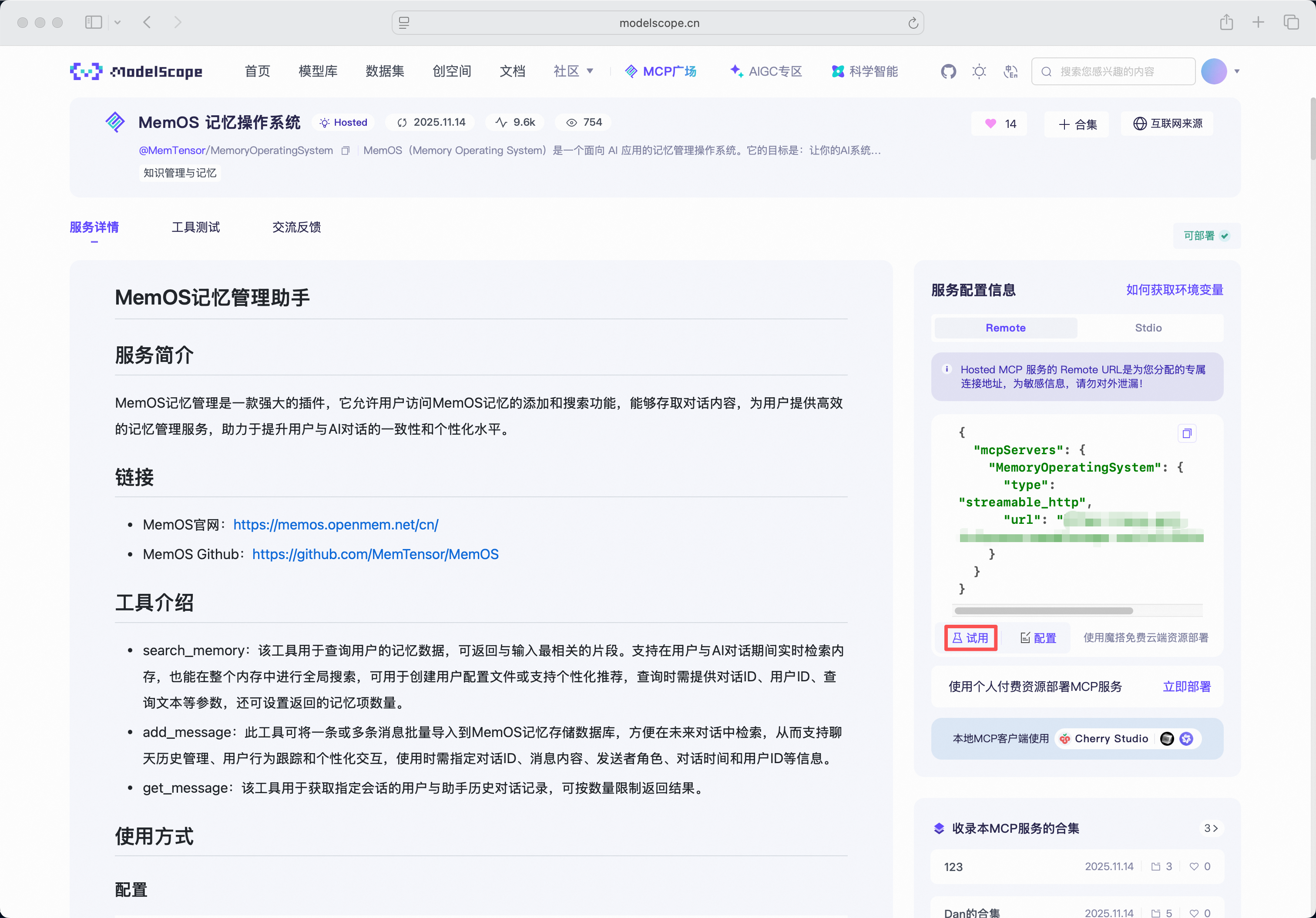 成功部署 MemOS MCP 服务后点击链接下方的“试用”按钮,即可在魔搭社区的 MCP 实验场尝试使用该服务。(需要绑定阿里云账号以实现模型推理)