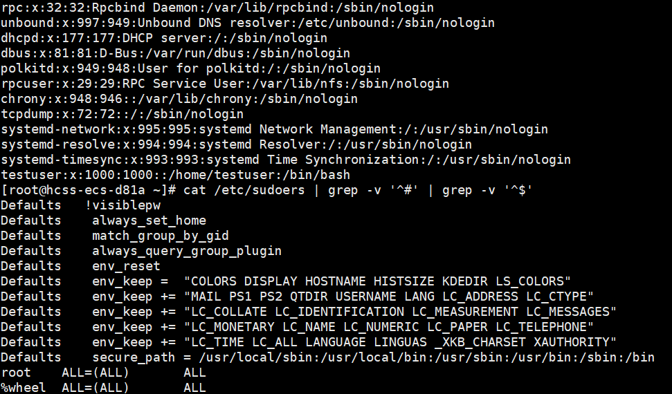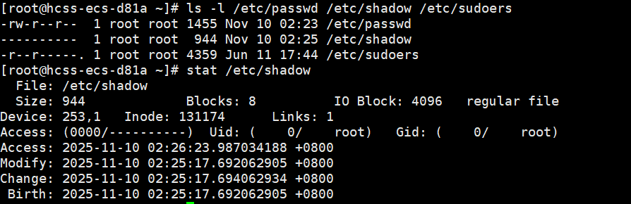 下面我们来查看/etc 目录下 shadow passwd sudoers 系统敏感配置文件的权限信息,确保 shadow 文件仅 root 可读写。