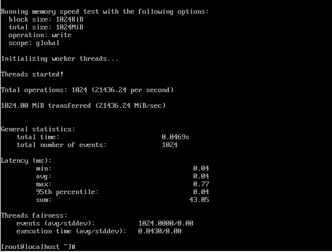 然后我们在使用以下命令输出内存读写的总耗时、每秒传输的块数(ops/sec)、每秒数据吞吐量(MiB/sec),来衡量系统内存的读写效率、数据传输速度及稳定性。
