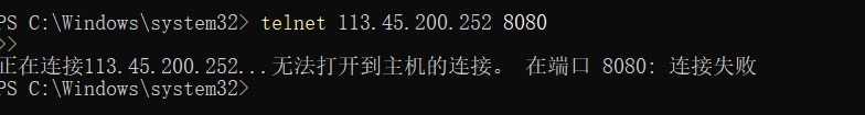从测试结果来看,当使用另一台机器通过 telnet 命令访问目标服务器的 8080 端口时,出现了连接失败的提示。说明防火墙基于预设的安全策略对未授权的端口访问请求进行了拦截,有效阻止了外部对该端口的连接尝试。