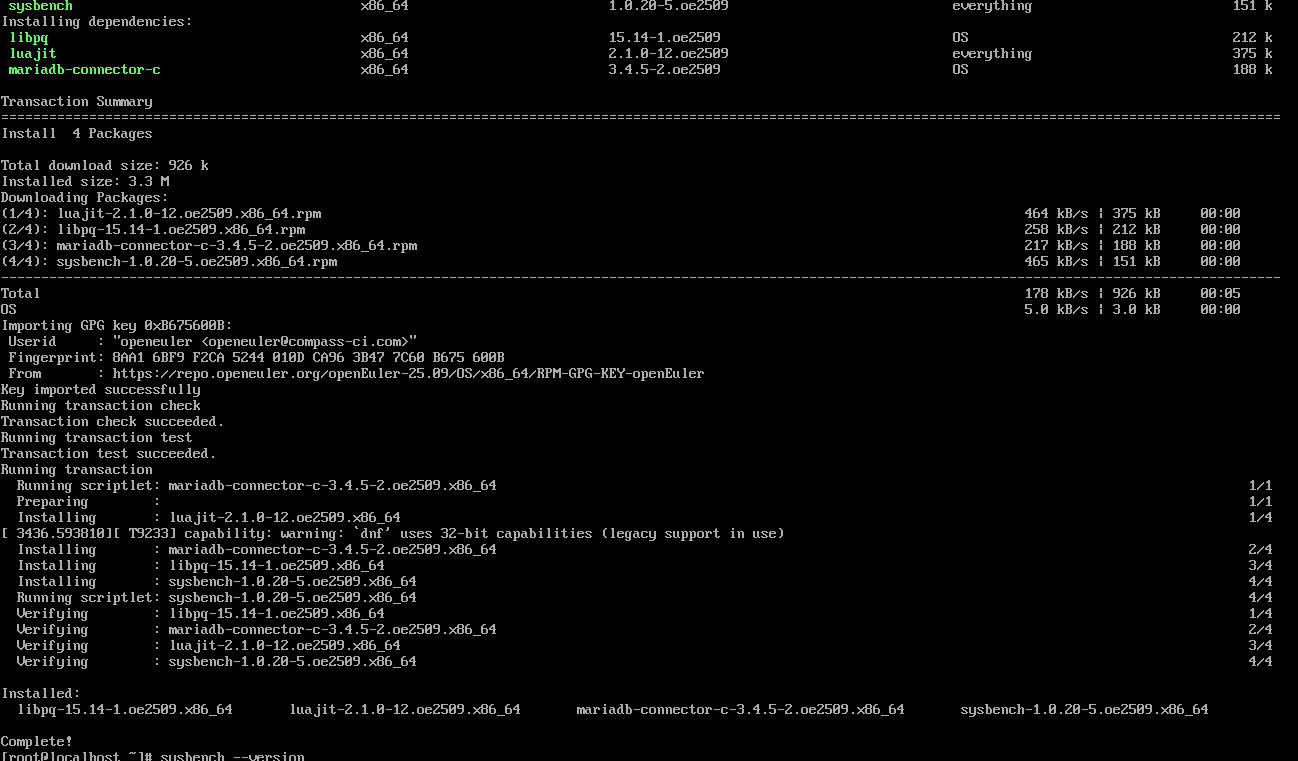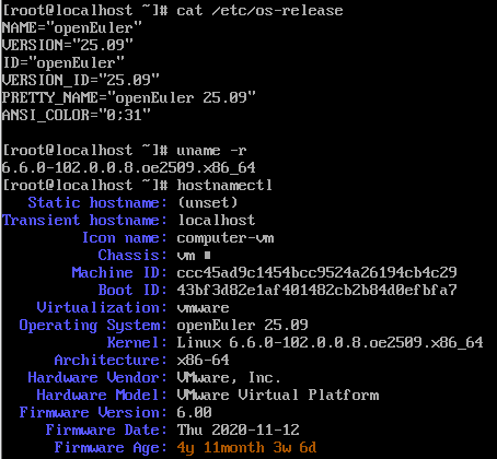 从以上信息就可以看出咱们本次测试的系统为openEuler 25.09,这是基于 Linux 6.6 内核的企业级创新版本,具备多核高密、机密计算等特性,适用于服务器、云原生等场景。架构为x86-64框架其内核版本为6.6.0102.0.0.8.oe2589.x86_64。