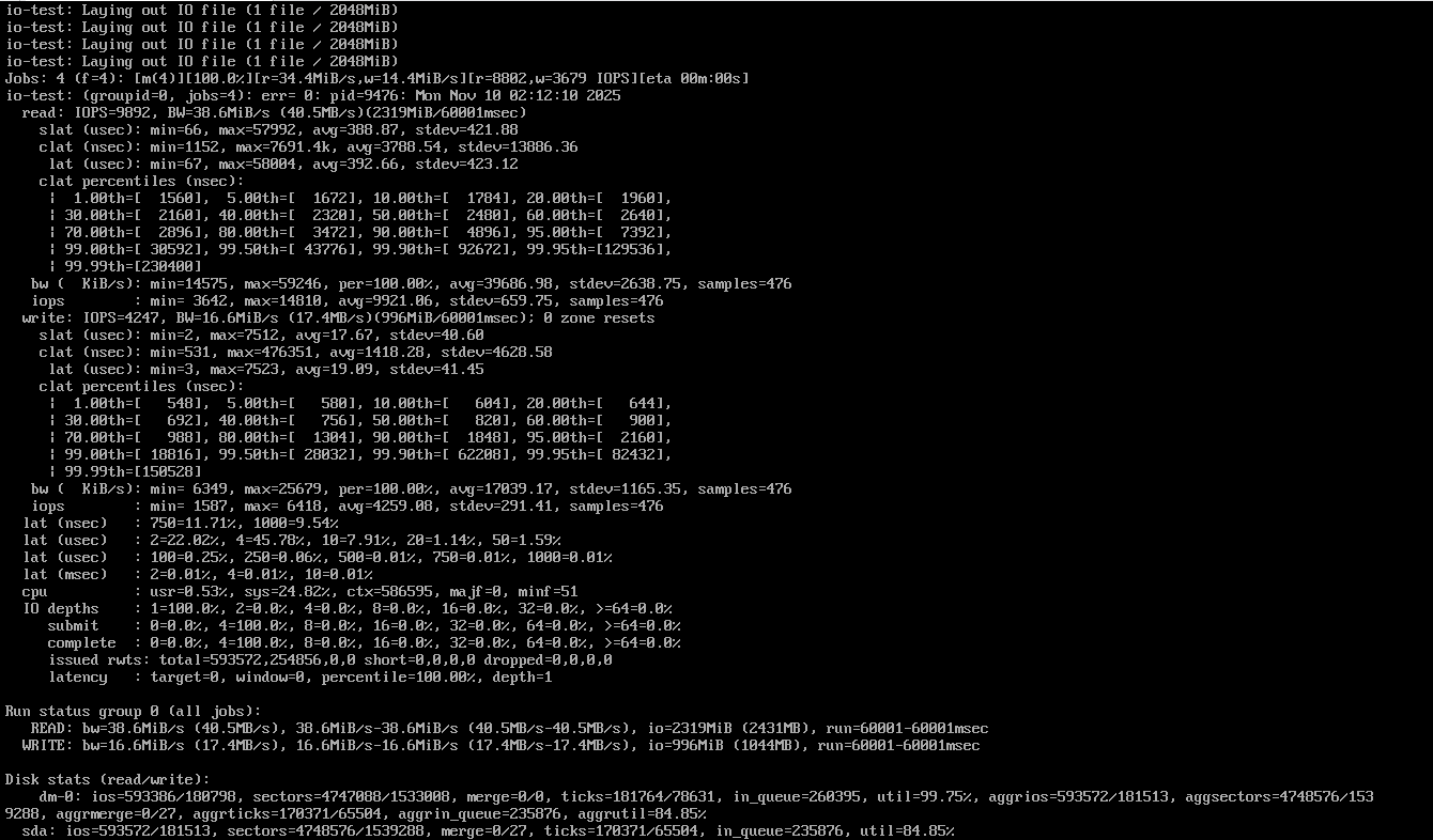 然后我们运行以下命令,该命令会输出每秒读写次数(IOPS)、每秒读写吞吐量(Bandwidth)、读写延迟等关键指标,可用于评估磁盘在随机混合读写场景下的并发处理能力、性能稳定性及响应速度。