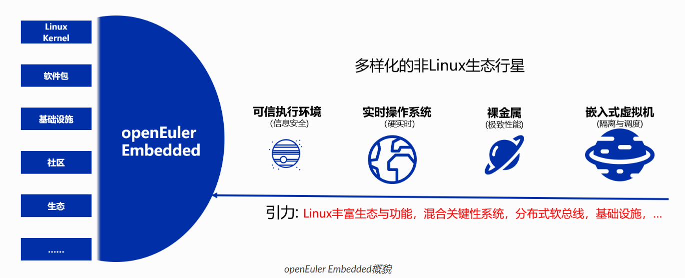 openEuler Embedded 旨在成为一个以 Linux 为中心的综合嵌入式软件平台。如上图所示,openEuler Embedded 中各组成部分的关系类似于一个“太阳系”的结构: 复杂而强大的 Linux 平台作为整个星系的中心,提供丰富的生态与功能、强大的基础设施,而不同的非 Linux 运行时“行星”则围绕着 Linux 这颗“太阳”提供各具特色的功能与生态,例如通过硬实时操作系统(Real-Time Operating System, RTOS)可以满足 us 级的硬实时的需求, 基于可信执行环境(Trusted Execution Environment, TEE)技术的运行时可以保障信息安全、与硬件紧密结合的裸金属运行时可以实现极致性能、借助硬件辅助的虚拟化技术嵌入式虚拟机可以实现不同运行时之间的高效隔离和灵活调度等。openEuler Embedded 以 Linux 丰富的生态与功能、重点构建的混合关键性系统、分布式软总线等关键特性、以及作为一个平台所必须的基础设施等为“引力”,把诸多的运行时与 Linux 有机地集成在一起。