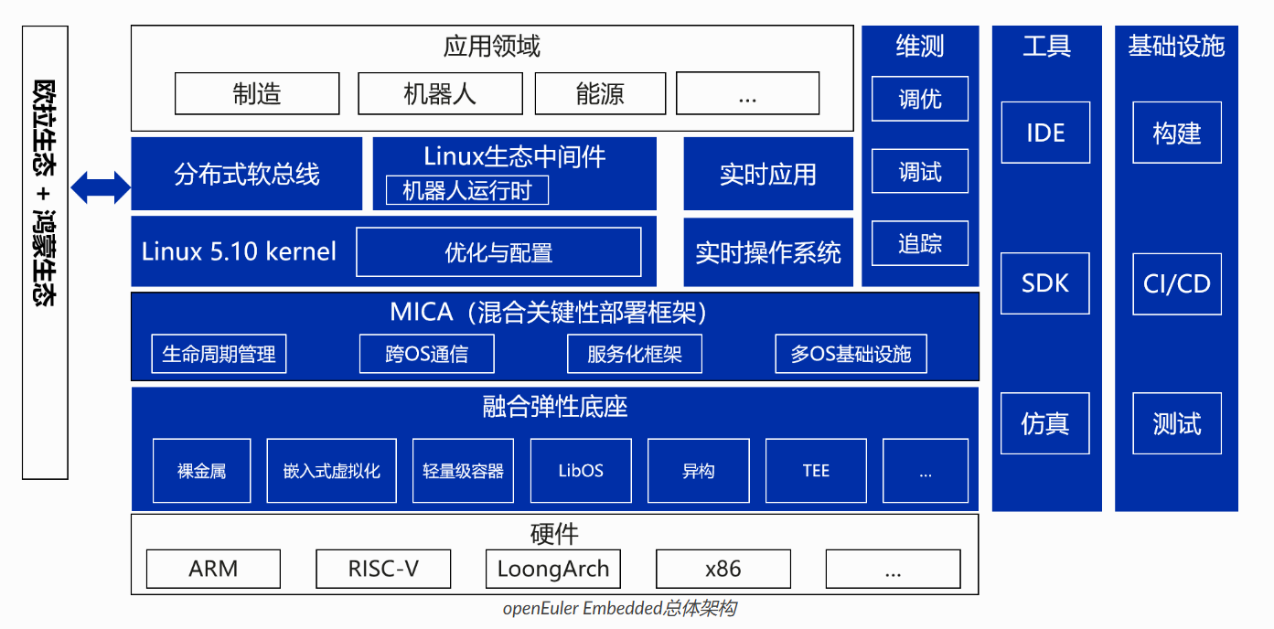 混合关键性部署框架(MICA):构建于 FusionDock 之上,通过统一接口屏蔽底层实现差异,提供生命周期管理、跨 OS 通信、服务化框架、多 OS 基础设施四大核心能力,实现 Linux 与 RTOS、裸金属运行时等的高效混合部署。