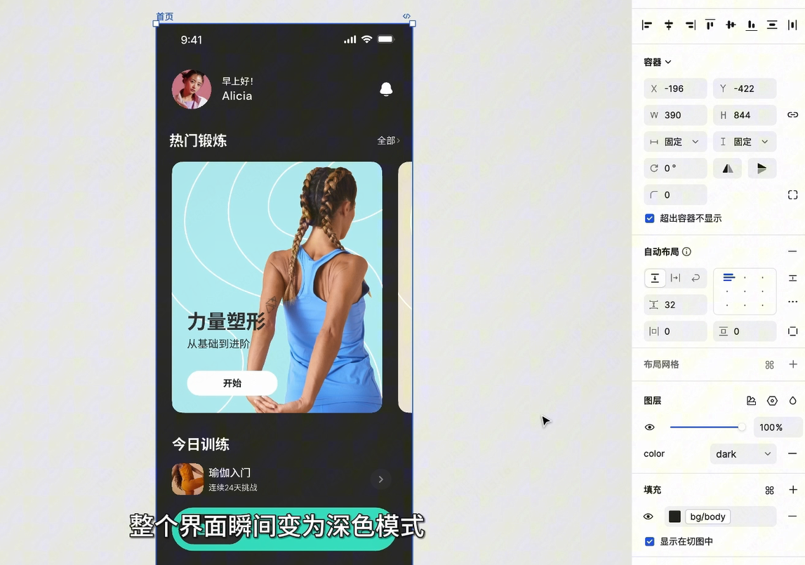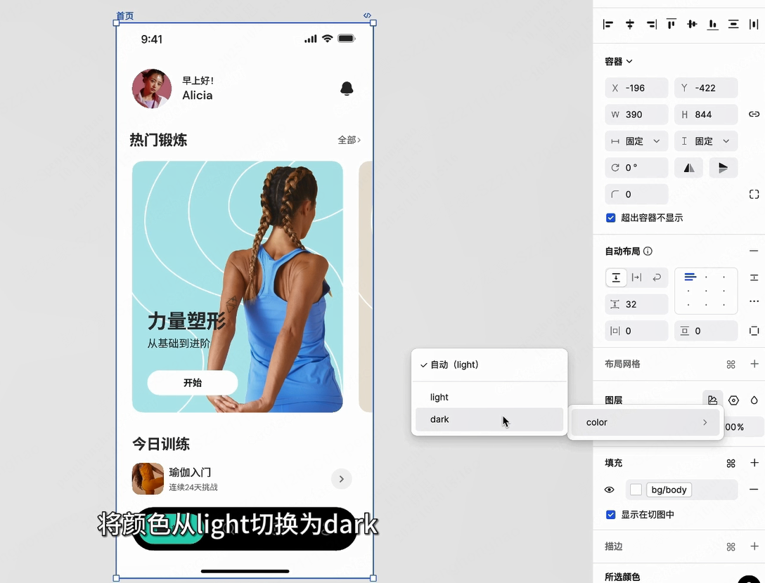 选中设计稿容器,点击切换变量模式,将颜色从 light 切换为 dark。