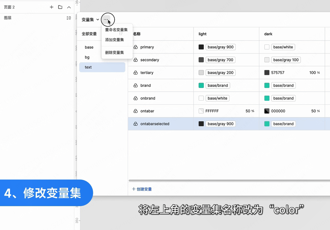 将左上角的变量集名称改为“color”,用于管理颜色;根据需要可创建多个变量集以放置不同的变量类型。