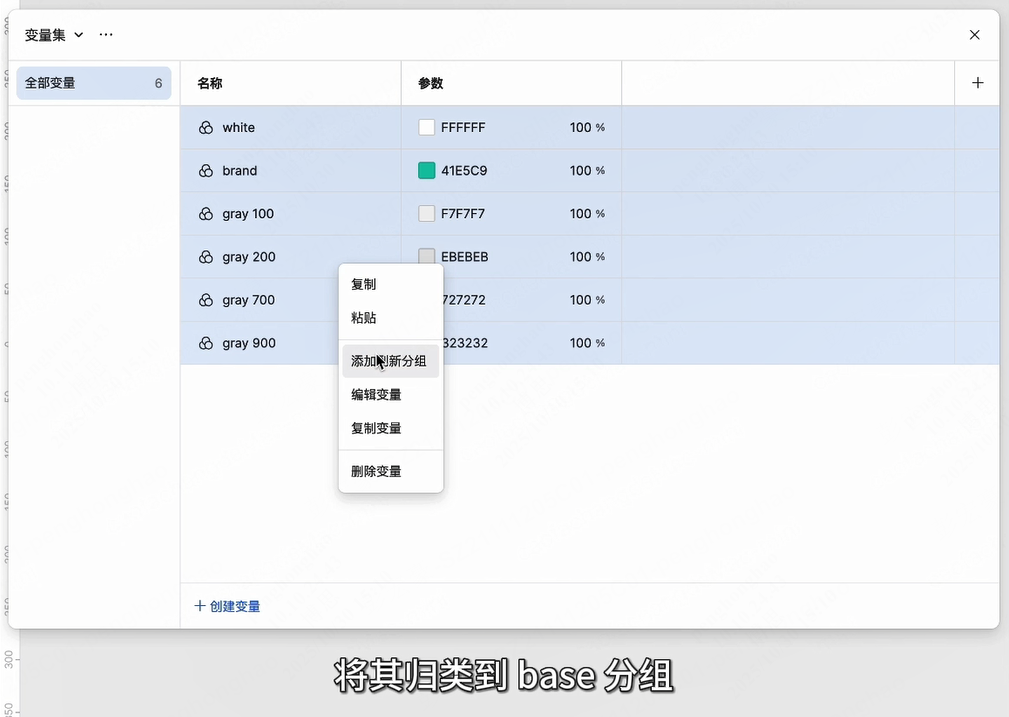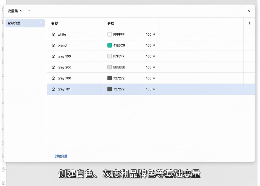点击创建变量,选择颜色变量,我们先建立基础颜色变量。按照语义化命名原则,创建白色、灰度和品牌色等基础变量。