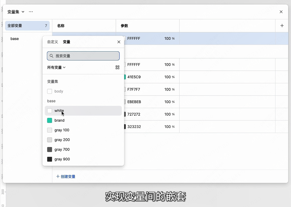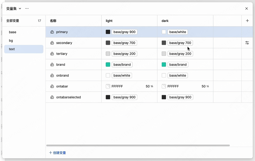 接着创建语义化变量,用于具体的界面元素,可引用前面的基础变量作为值,实现变量间的嵌套。