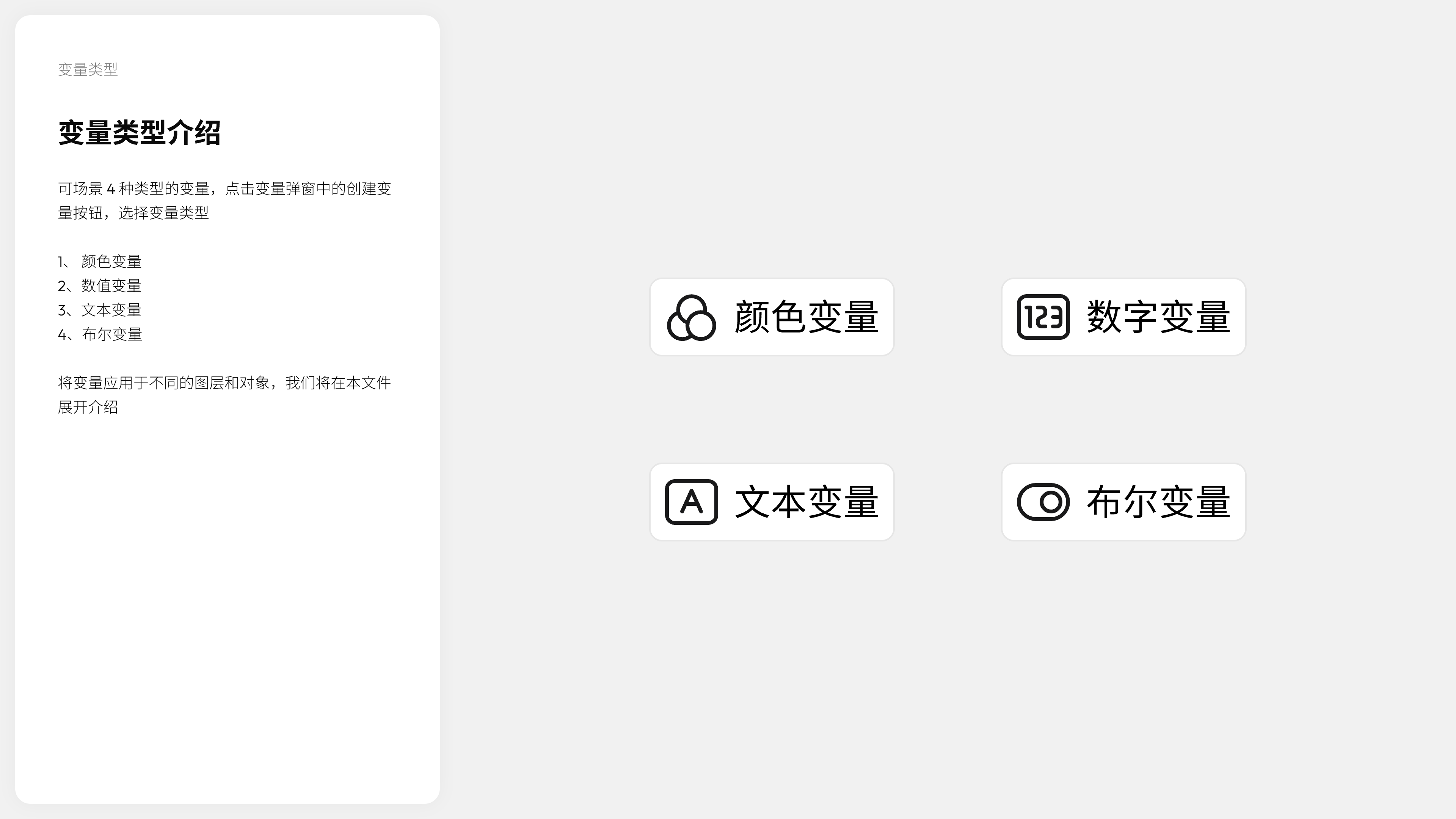 变量(Variables)是一种可重复使用的设计元素存储机制,它能够将颜色、数值、文本和布尔值等设计属性封装成可复用的基本单元。