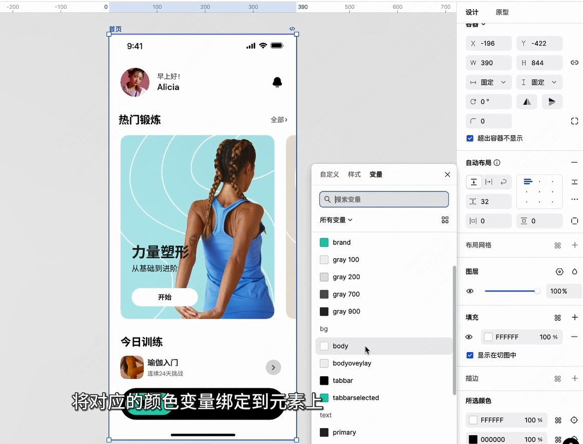 变量创建完成后,接下来将它们应用到设计稿中。选中设计元素,在颜色面板点击变量标签,将对应的颜色变量绑定到元素上。
