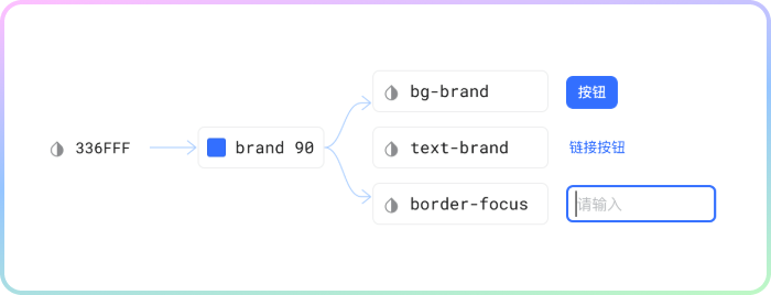 譬如一个色值为 #336FFF 的颜色,在 Pixso 中定义为 brand 90 的颜色变量,同一个色值可以按需应用到不同场景中——按钮背景色、文本颜色以及图形描边颜色等,最明显的变化就是在不增加样式定义的情况下,达到和以往多个样式设置的效果,且得益于变量的嵌套关联特性,当改动基础变量的色值时,可快速实现局部或全部的自动更改,最大程度提升了设计系统的管理效率。