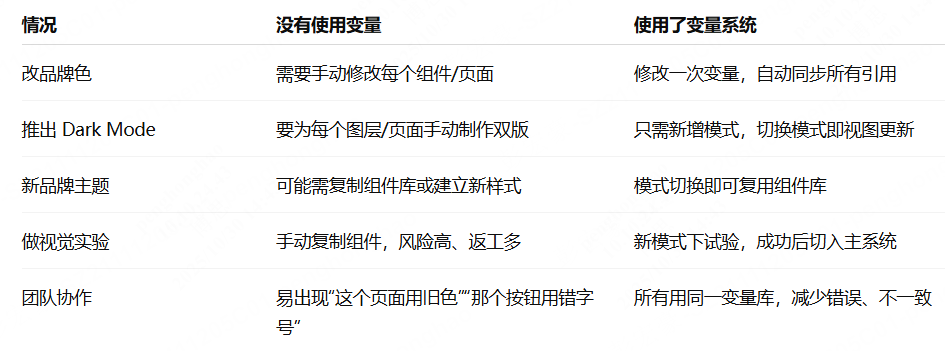 实际上,变量的使用场景非常广泛,尤其是涉及多人协作的大型项目,前置环节看起来稍微有点繁琐的变量(变量的定义、嵌套和绑定),相较于样式有无可比拟的优势。