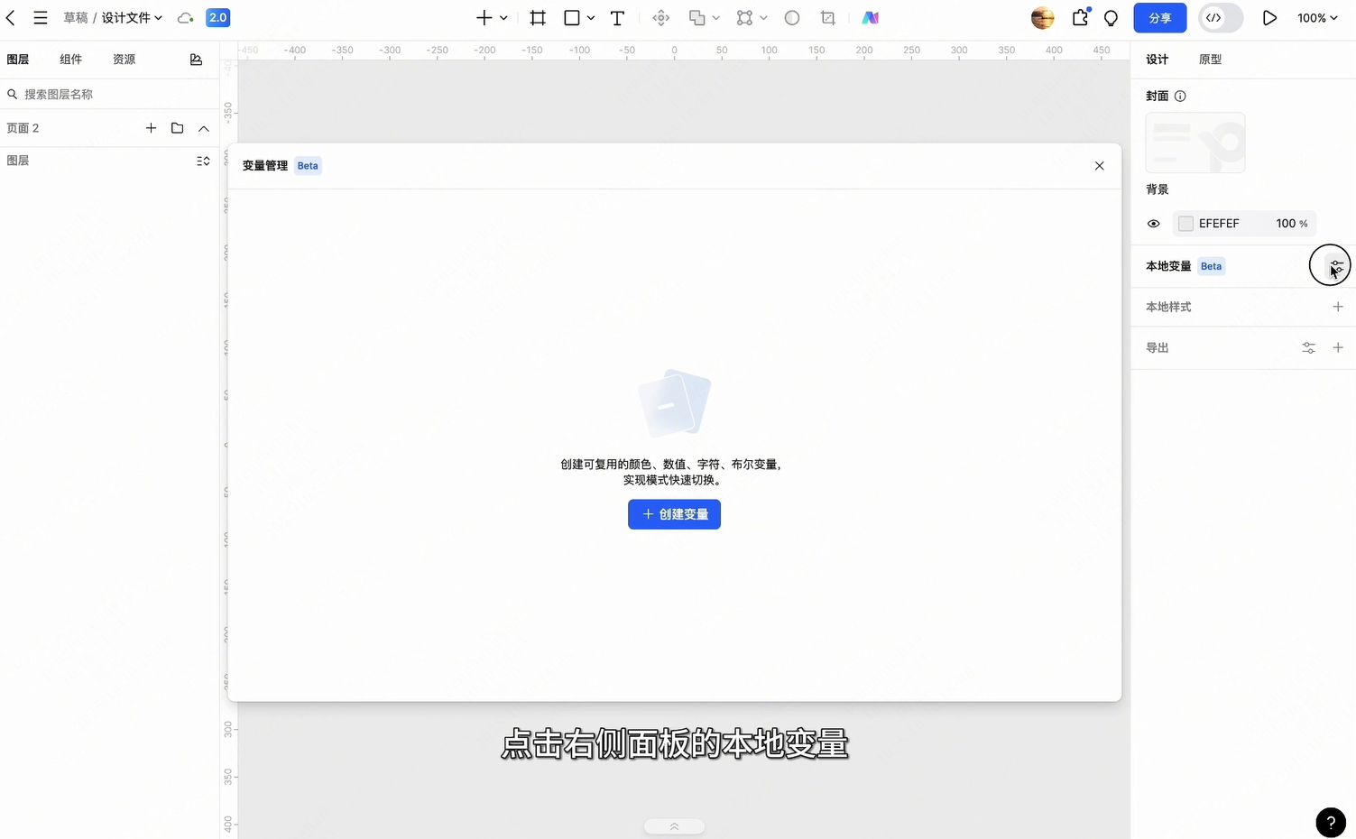在没有选中任何元素的情况下,点击右侧面板的本地变量,打开变量管理面板。