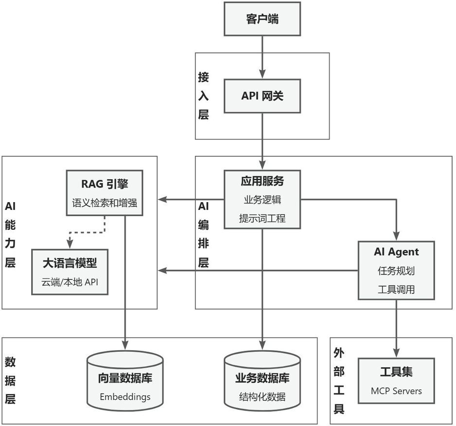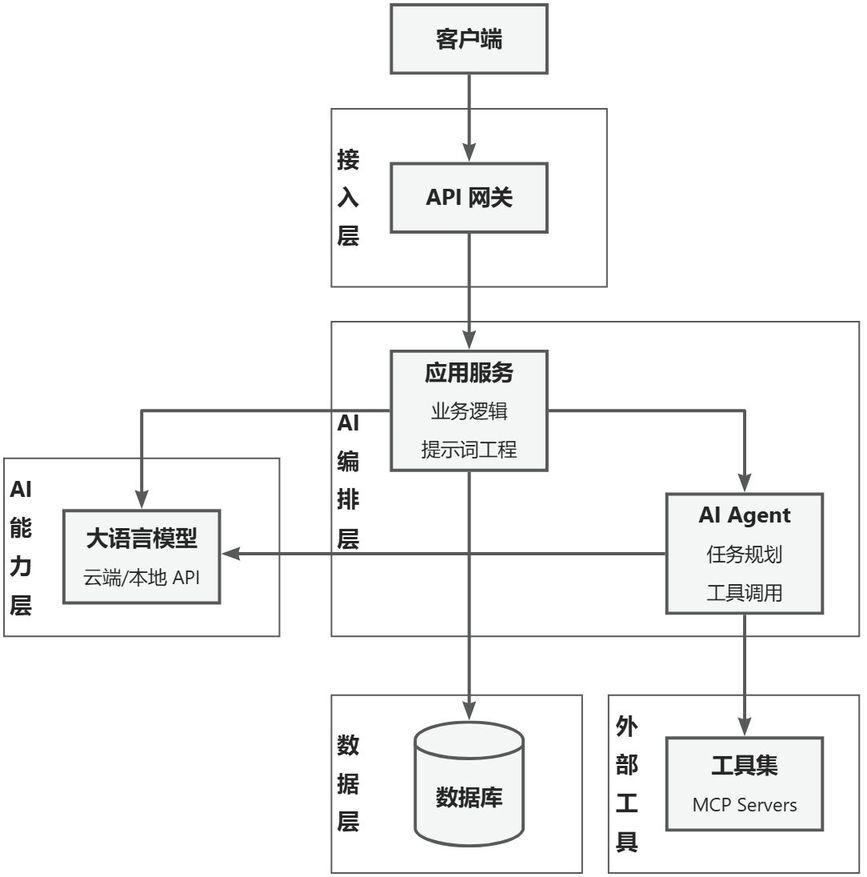 严格意义上讲,这种模式还不能算是 AI 驱动的应用,只能算是 AI 的工具集成。此时的大语言模型像某个 RPC 服务,在特定的业务流程中被业务代码调用,只不过调用参数不是静态的,而是由提示词工程(Prompt Engineering)拼接。AI 驱动的应用也就是将业务诉求委托给 AI 处理,而大模型就像是一个只能踢一下动一下的“脑袋”,还需要给它装上“手脚”,让它自己能“跑”起来。故此,编排层将增加 AI 代理框架,负责任务规划和工具调用,如 SpringAI 和 MCP Client,外部工具则以 MCP Server 的方式提供。