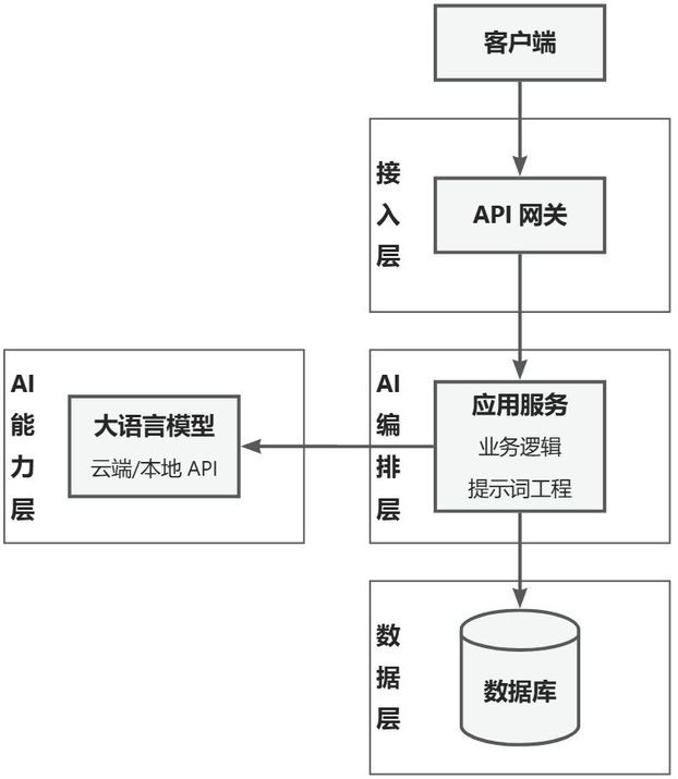 AI 原生应用从流量路径来说与传统应用一样都是分层架构,关键组件有所不同。AI 原生应用的业务逻辑由模型驱动,此时应用层的重心不是业务逻辑的直接实现,而是对 AI 调用的编排。自然地,以最基础的 AI 问答类应用为例,AI 原生应用是一个“接入层-AI 编排层-AI 能力层-数据层”四层架构,如下图所示。