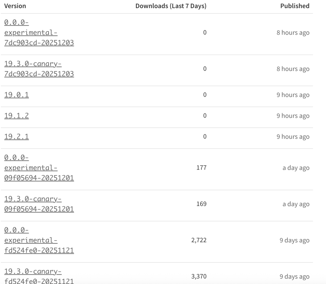 这 3 个组件的实际使用量在 npm 生态中不大,这 3 个组件官方声明都是实验性阶段的 React Flight 协议 binding 组件。其中 react-server-dom-webpack 受影响版本最近一周在 NPM 仓库下载量约 15 万、react-server-dom-turbopack 每周下载量 3 万、react-server-dom-parcel 每周下载量不到 3 千。