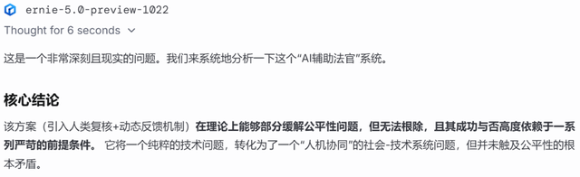 不知道大家看完,感觉怎么样,反正 gpt-5-high 是给出了 9.5 的高分,表示 ERNIE-5.0-Preview-1022 给出了“一个接近完美的答案”,展示了如何系统性地思考一个交织了技术、伦理和社会制度的复杂问题。