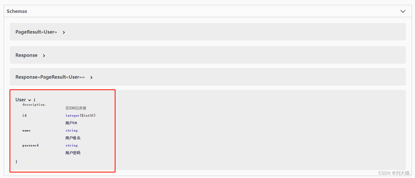 /** * @Author 211145187 * @Date 2022/2/23 09:32 **/@Data@AllArgsConstructor@NoArgsConstructor@ApiModel(description= "返回响应数据")public class User { @ApiModelProperty(name = "id", value = "用户ID") private Integer id; //姓名 @ApiModelProperty(name = "name", value = "用户姓名") private String name; //密码 @ApiModelProperty(name = "password", value = "用户密码") private String password;}