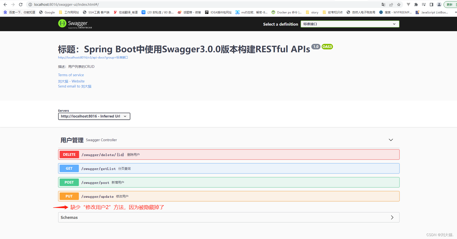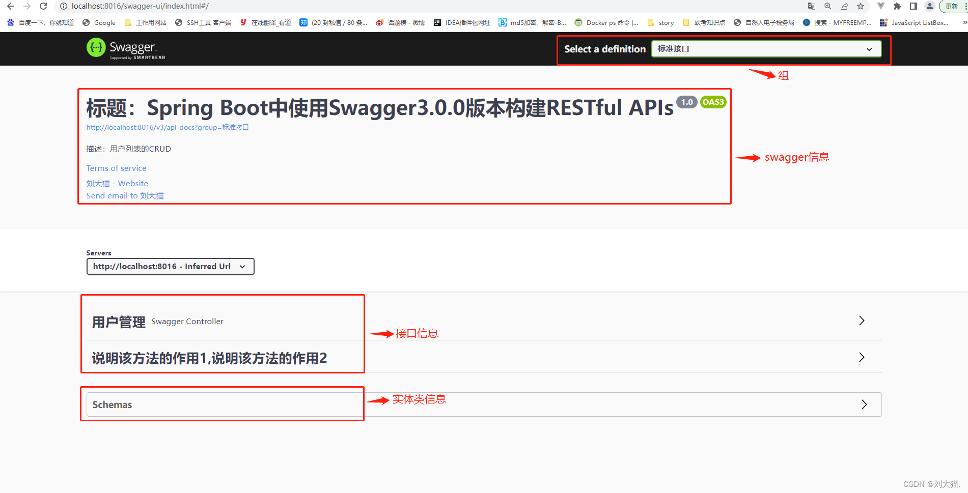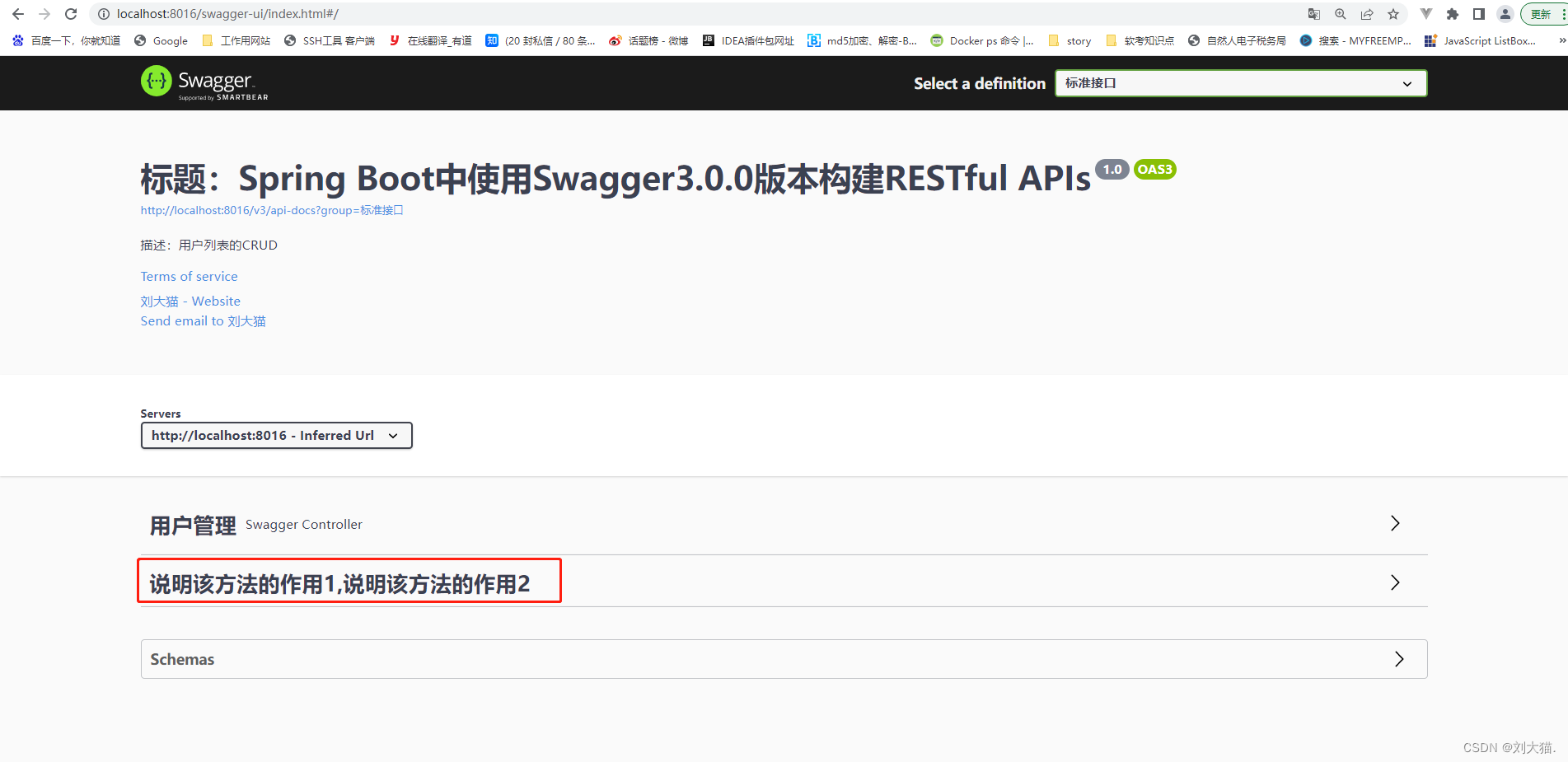 /** * 配置文档描述 * 访问地址:http://ip:port/swagger-ui.html */ private ApiInfo apiInfo() { return new ApiInfoBuilder() //文档标题 .title("标题:Spring Boot中使用Swagger3.0.0版本构建RESTful APIs") //文档描述 .description("描述:用户列表的CRUD") //团队链接 .termsOfServiceUrl("https://blog.csdn.net/a924382407/article/details/127842503") //联系人信息 .contact(new Contact("刘大猫", "https://blog.csdn.net/a924382407/article/details/127842503", "ldz924382407@163.com")) //API 版本 .version("1.0") .build(); }}