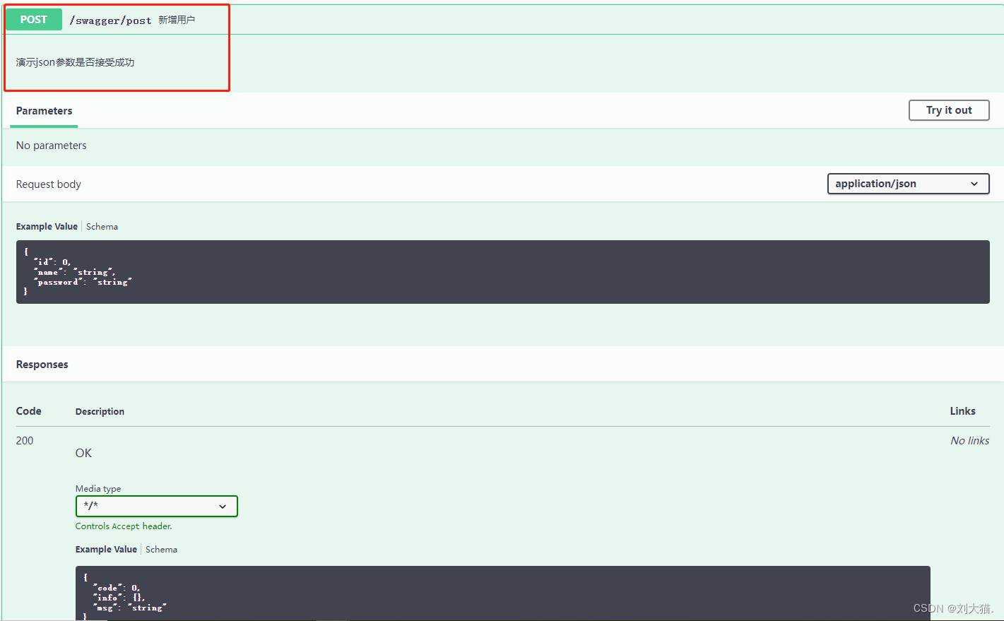 @PostMapping("/post") @ApiOperation(value = "新增用户", notes = "演示json参数是否接受成功") public Response postTest(@ApiParam(name = "user", value = "接收传递给后端接口的user对象参数") @RequestBody User user) { log.info("-postTest-user:{}", user); return Response.success(user); }