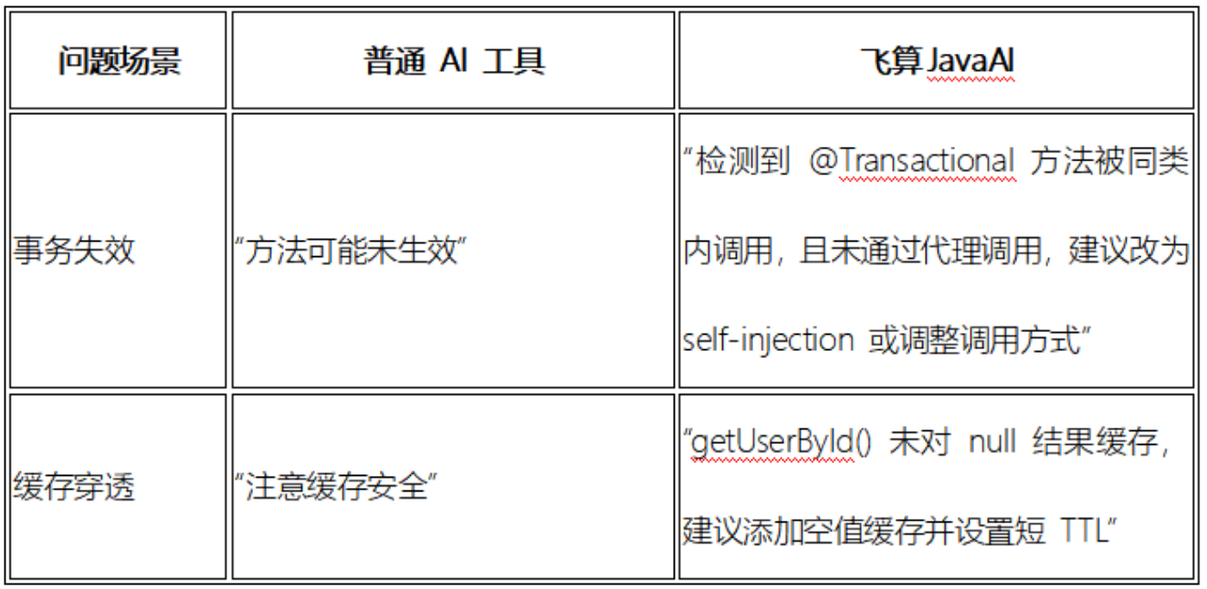 飞算 JavaAI 的训练数据来自大量真实 Java 项目,深度理解 Spring、MyBatis、Dubbo、Maven 等框架的运行机制和常见陷阱。例如: