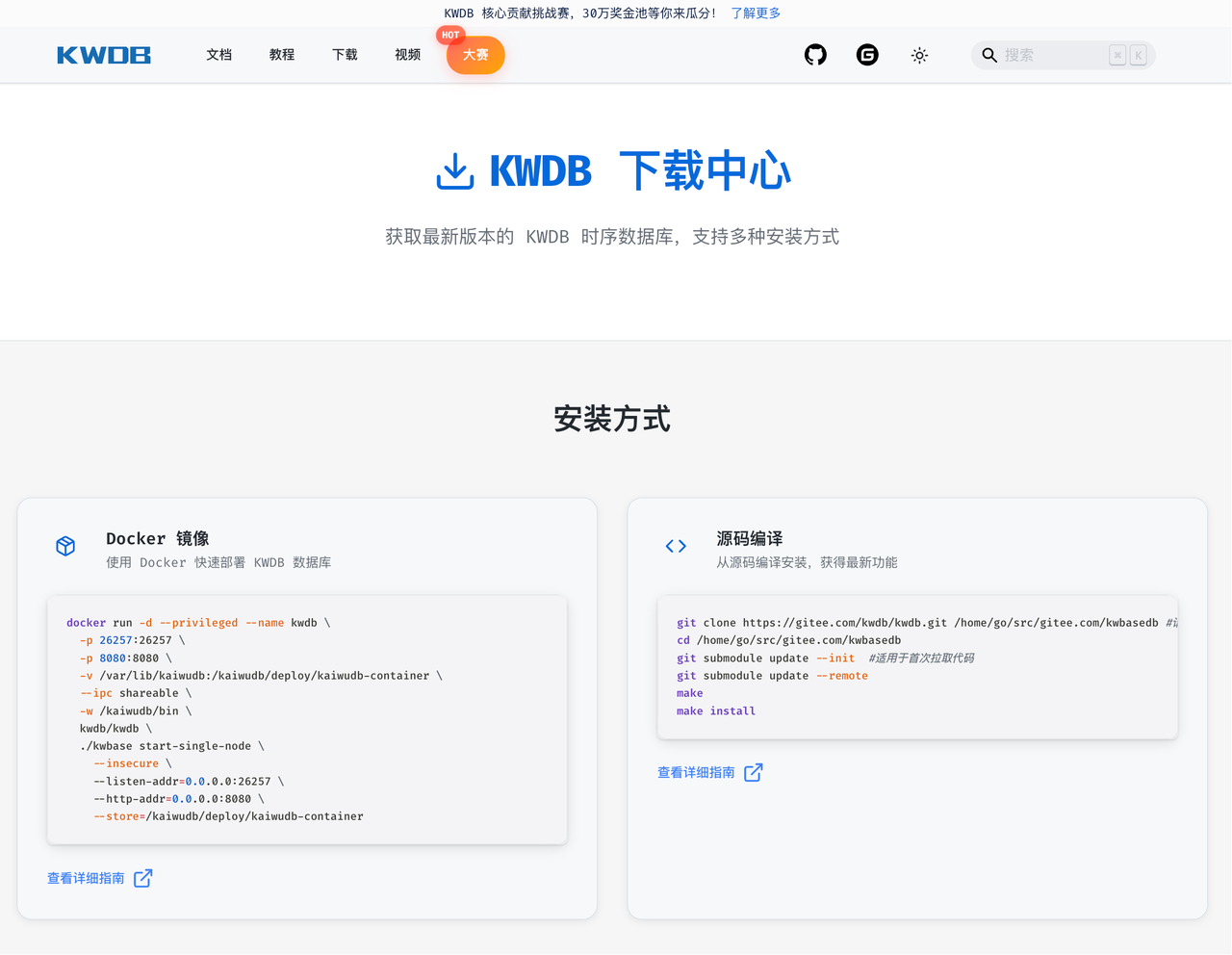 下载中心不仅提供 KWDB 最新版本的官方下载路径,还同步给出 Docker 等快速安装方式的命令示例。开发者可根据自身使用场景(如本地开发、容器部署等)选择最便捷的安装方案,大幅缩短从 "获取资源" 到 "启动使用" 的时间,提升开发效率。