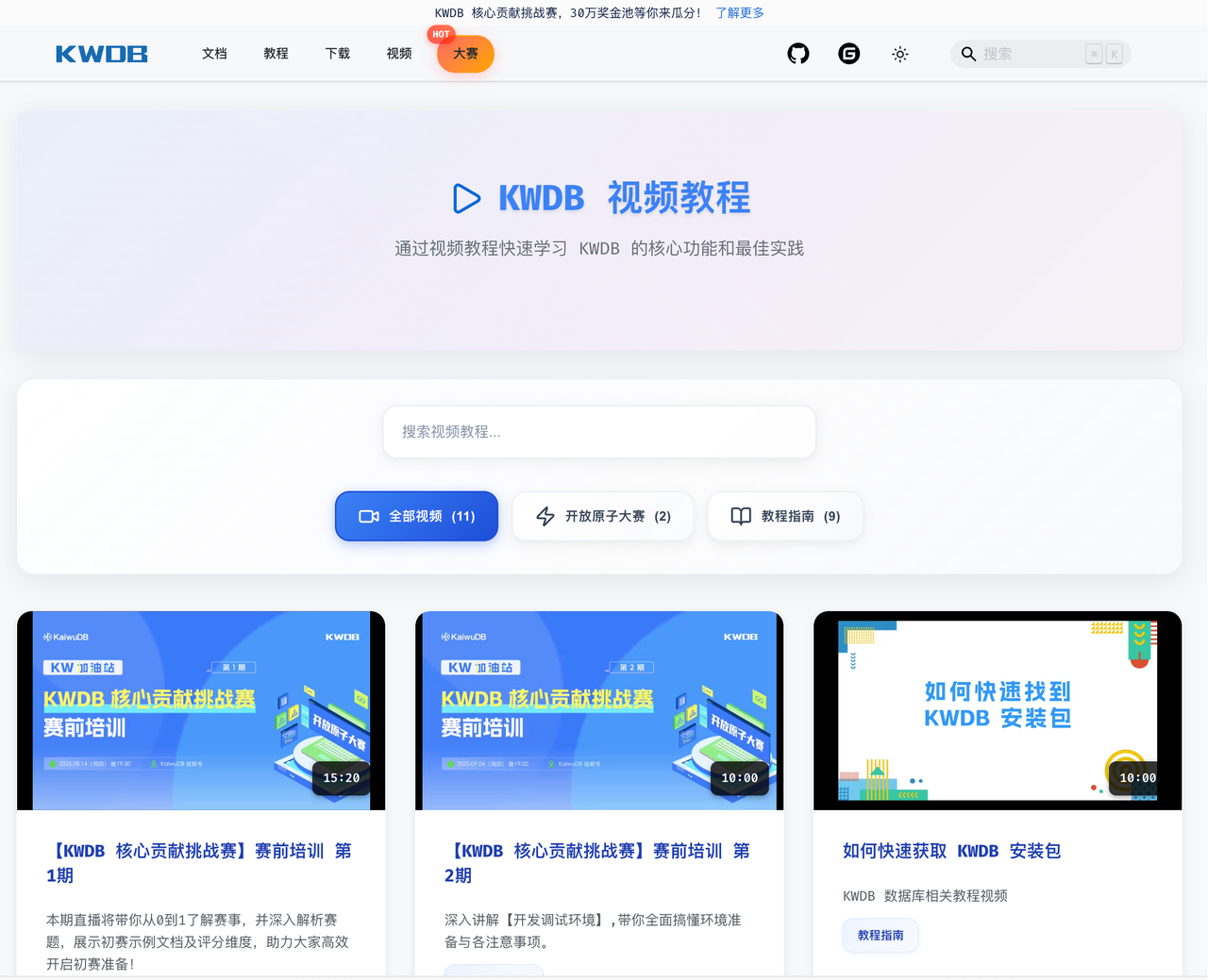 针对文字教程难以清晰讲解的复杂场景(如多步骤环境配置、内核开发环境搭建等),视频教程板块提供直观的可视化学习资源,同时适配开发者碎片化的学习习惯。该板块集中收录 KWDB 社区内与开发相关的视频内容,支持快速检索与在线观看,将复杂知识点拆解为易懂的视觉化内容,帮助开发者轻松理解并掌握。